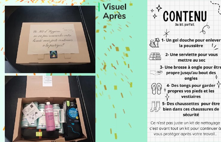 Lors de la surveillance individuelle renforcée des salariés par la médecine du travail, le sujet de la contamination des salariés lors de leur poste de travail a été mis en avant. En complément des actions techniques et organisationnelles mises en place, l’Hygiène industrielle reste un rempart important pour réduire cette exposition! Afin de renforcer et éveiller à cette problématique, il a été décidé de fournir l’équipement nécessaire et adéquat au personnel pour repartir après son poste sans substances dites CMR. L’équipement reprend en même temps les principales mesures de prévention (rappel).