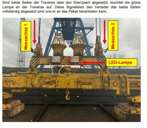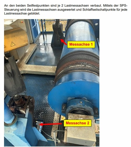 Des mesures de charge sont installés à chacun des deux points fixes du câble. Les mesures de la charge sont évaluées à l’aide de la commande SPS (commande programmable) et des points de commutation de mou de câbles sont formés pour chaque axe de mesure de la charge.